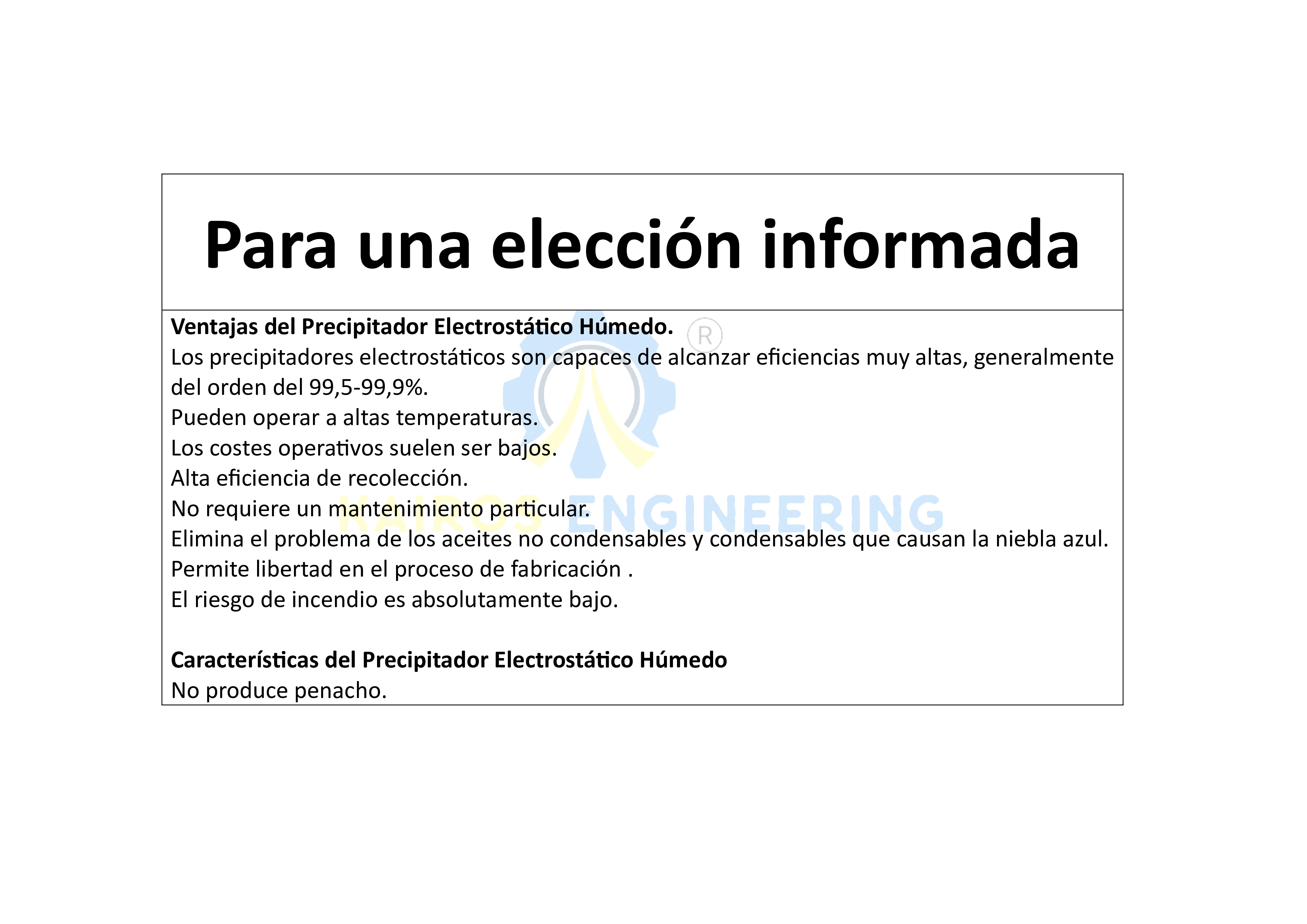 Precipitadores electrostáticos húmedos (WESP) offer efficient emission control for submicron particles, heavy metals, acid mists, and oil mists. Wet electrostatic filtration technology is an improvement over the Wet Scrubber system, with the important advantage of combining the removal of coarse particles (Ø> 20 • m), through a pre-washing treatment, with the reduction of the micron and submicron fraction of the residue (in the form of mist, for example, oil mist), responsible for the visual opacity that often manifests as a "blue smoke" easily visible from great distances. By introducing a pre-moistened washing section, it is possible to prevent clogging of the aforementioned electrostatic collection section (due to the coarse fraction of particles), with obvious advantages in terms of cleaning efficiency and system removal. With this machinery, no smoke is seen coming out. This is an advantage for the population surrounding the factory.