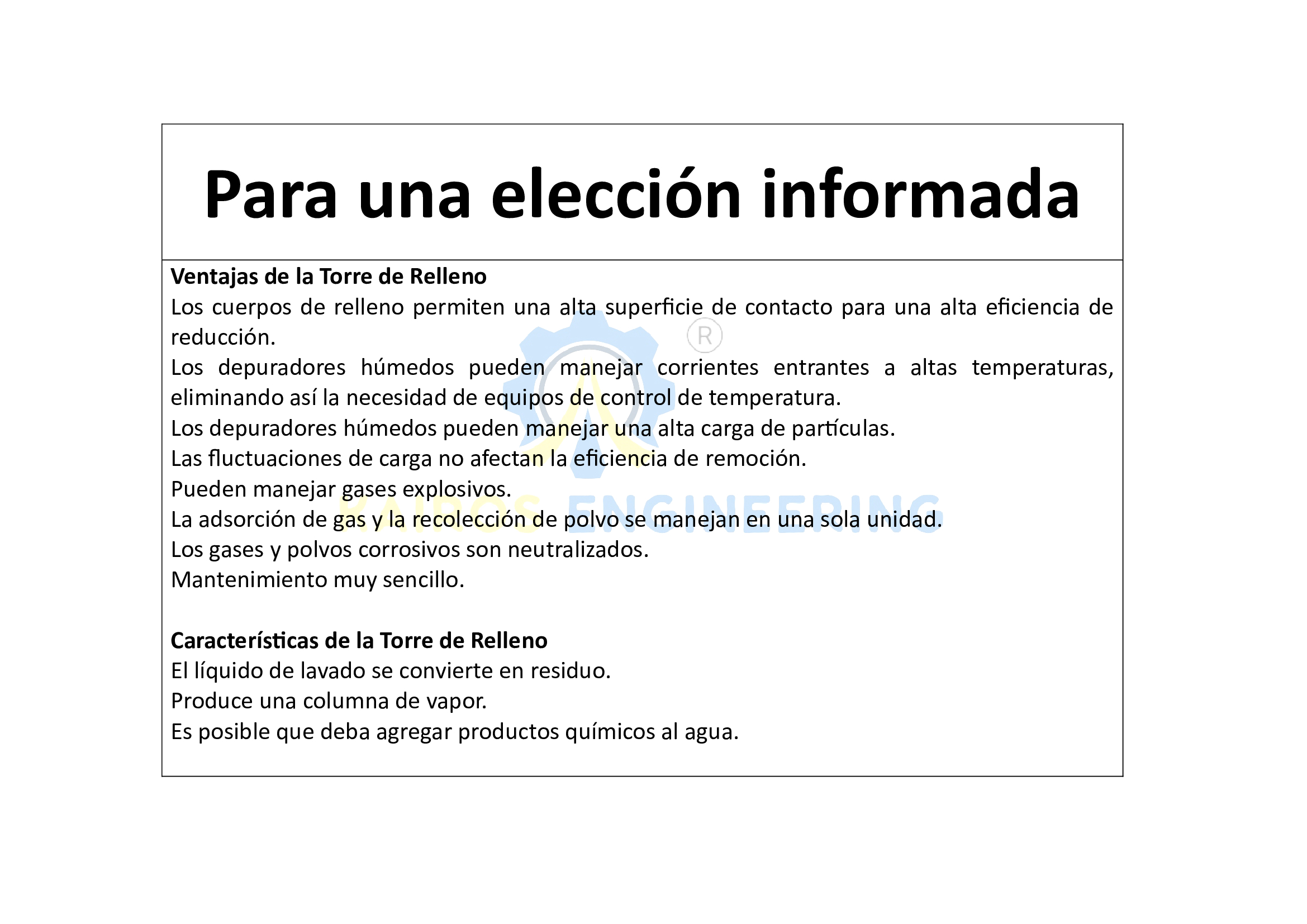 Los depuradores de lecho están diseñados para eliminar contaminantes gaseosos o vaporosos de una corriente de aire. El proceso se lleva a cabo poniendo en contacto la corriente de aire contaminado con un líquido de lavado que absorbe o reacciona químicamente con los contaminantes. Luego, el aire purificado se descarga en la atmósfera y el líquido de lavado contaminado se elimina en el medio ambiente, el cual puede recuperarse y reutilizarse en otros procesos. En el diseño de contracorriente vertical, el gas fluye hacia arriba mientras que el líquido de lavado fluye hacia abajo a través de bancos rociadores. La absorción de los gases se produce en la sección de relleno aleatorio de los depuradores y el líquido de depuración se introduce en un sistema de distribución de líquido o pulverización. Un separador de neblina altamente eficiente elimina los líquidos atrapados. El aire purificado es expulsado en la atmósfera.