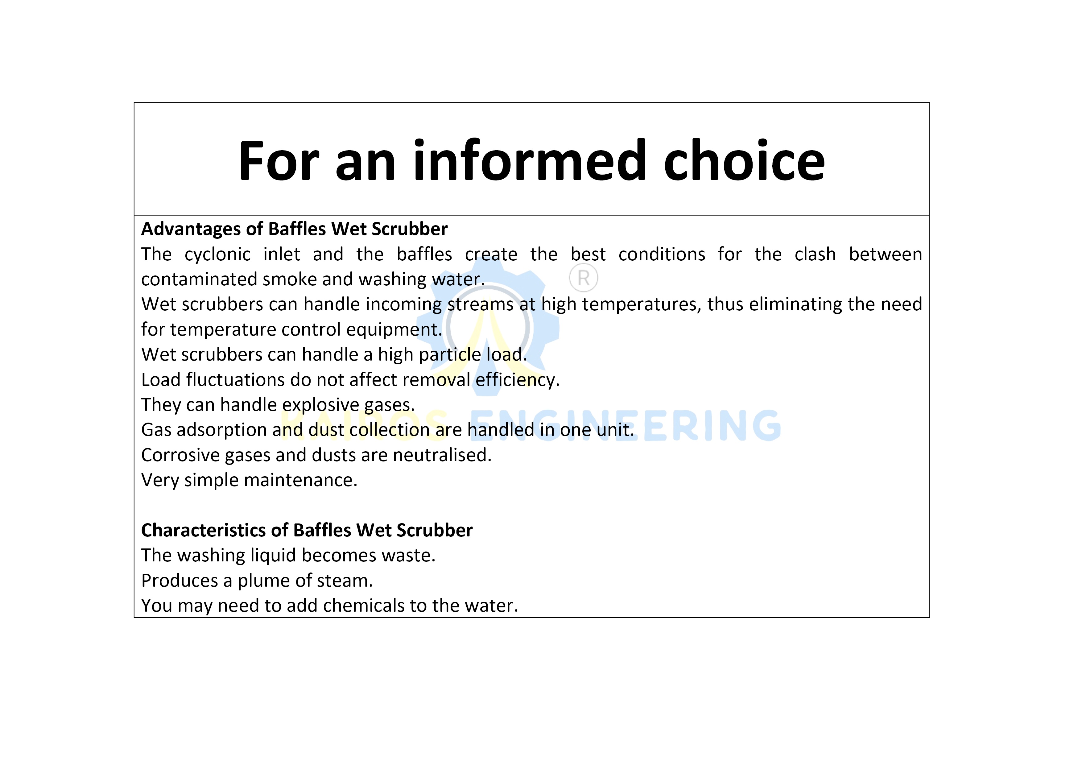 Deflector spray scrubbers are an air pollution control technology. They are very similar to spray towers in design and operation. However, in addition to using the energy provided by the spray nozzles, baffles are added to allow the gas flow to atomize liquid as it passes over them.